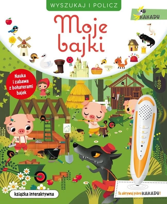 Moje bajki. Wyszukaj i policz to książka interaktywna z piórem Kakadu, które uruchamia zakodowane na stronach teksty i dźwięki. Publikacja jest częścią innowacyjnego systemu nauki i zabawy w jednym. Każda strona to mnóstwo zabawy w wyszukiwanie i liczenie. Zadaniem małego czytelnika jest znajdowanie i liczenie ukrytych obiektów: 1 wilk, 2 drabiny, 3 filiżanki, 4 sikorki, 5 kaczątek... w bajkowej scenerii: Czerwonego Kapturka, Księgi dżungli, Brzydkiego Kaczątka, Kota w Butach, Trzech Małych Świnek, Małej Czerwonej Kurki oraz Złotowłosej. Maluchy bawiąc się, rozwijają spostrzegawczość i nabierają wprawy w liczeniu do pięciu. Poznają także około 100 słów na uroczych i pełnych szczegółów ilustracjach. Dodatkową atrakcją książki są baśnie do słuchania. Wystarczy zbliżyć pióro do odpowiedniej ikonki. Wyszukaj i policz bajkowe postaci oraz rzeczy! Rozwijaj wyobraźnię, słuchając bajek!