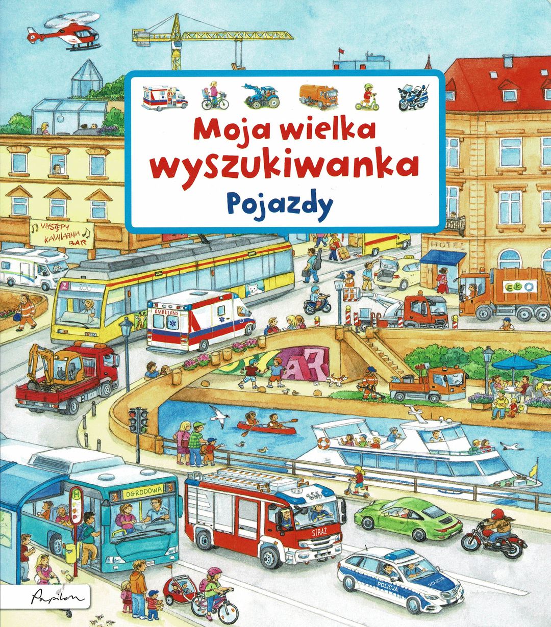 Dla tych, którzy kochają samochody i inne pojazdy. Dla tych, którzy cieszą się, wyszukując szczegółyna kolorowych, pełnych detali ilustracjach. 11 plansz ukazujących dziesiątki sytuacji z udziałem pojazdów,takich jak auto policyjne, karetka pogotowia czy wóz strażypożarnej. Obok każdej planszy krótka historyjka opisująca przedstawione miejsca oraz obrazki zachęcające do zabawy w wyszukiwanie. Kartonowa, trwała książka dla maluchów i przedszkolaków.