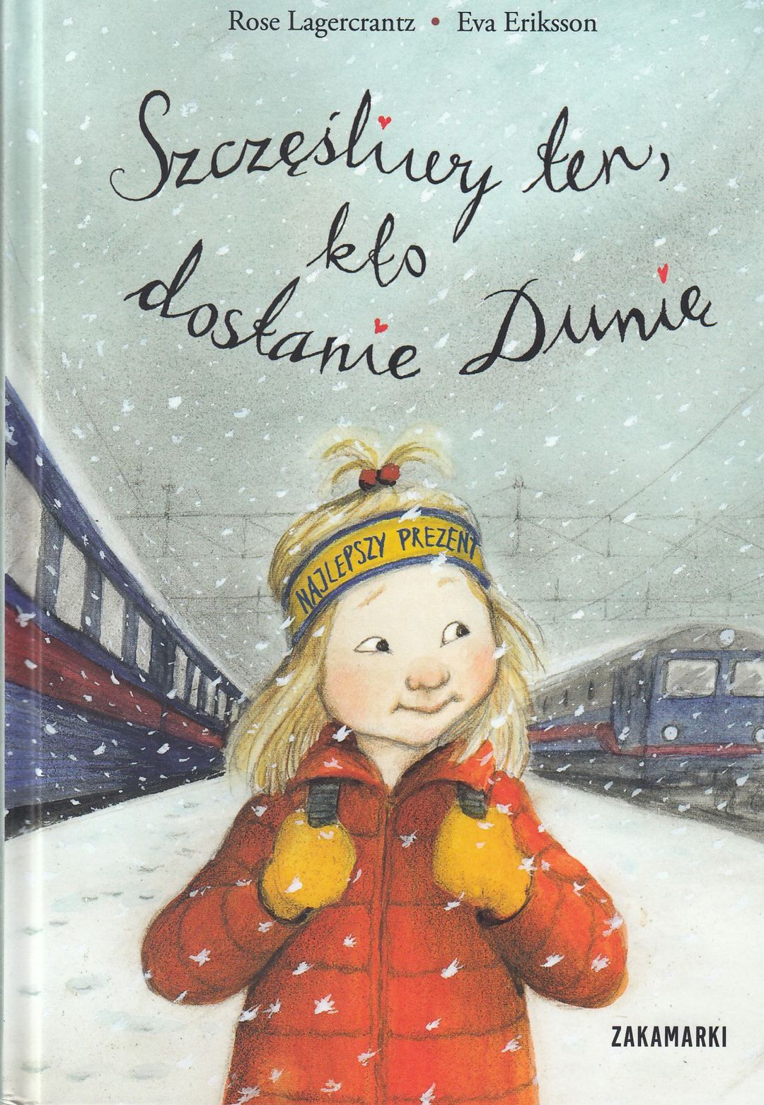 Właśnie rozpoczęły się ferie zimowe w drugiej klasie. Dunia tak bardzo tęskni za swoją przyjaciółką Fridą, która musiała przeprowadzić się do Uppsali! Podczas jazdy na nartach Dunia przewraca się i leżąc w śniegu, doznaje olśnienia. Czy Frida nie ma czasem urodzin w czasie ferii zimowych? W takim razie Dunia musi koniecznie się z nią spotkać i dać jej prezent. Okazuje się niestety, że nikt nie może z nią jechać. Babcia proponuje, by Dunia pojechała sama. To będzie jej pierwsza samodzielna wyprawa pociągiem. Czy wszystko pójdzie zgodnie z planem? Książki o Duni to historie o uczuciach i przeżyciach bliskich dziecku opowiedziane z jego perspektywy. Przeznaczone są dla początkujących czytelników nie tylko ze względu na treść, ale i formę. Czytanie ułatwiają: prosty język, duża czcionka, przejrzysty układ strony i świetne rysunki Evy Eriksson.