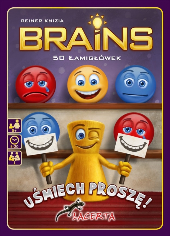Brains Uśmiech proszę! / Reiner Knizia. - Niemcy : Pegasus Spiele GmbH, 2016. - 1 gra (25 dwustronnych plansz, 28 żetonów, 6 pionków, 1 instrukcja, 1 książeczka z podpowiedziami) : karton, tektura, drewno, ilustracje, wielokolorowy ; w pudełku 18x13x4 cm + instrukcja (5, [3] strony : ilustracje ; 15 cm) ; książeczka z podpowiedziami (52 strony : ilustracje ; 15 cm).