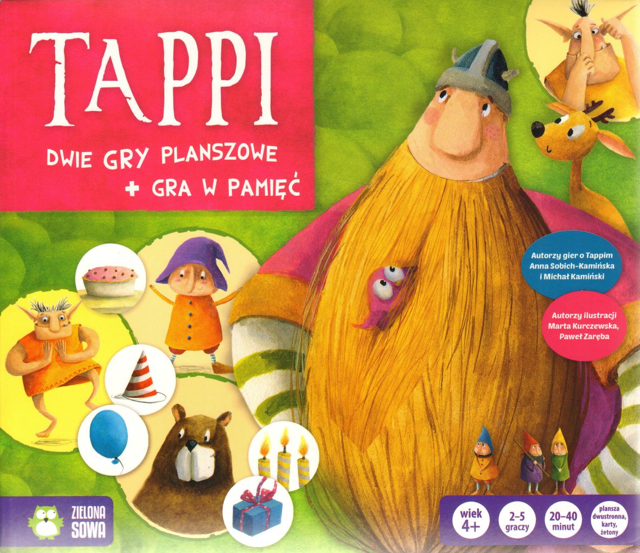 Tappi / gry Urodziny Tapiego i Urodzinowa gra w pamięć na podstawie serii książek Marcina Mortki ; autorzy gier o Tappim Anna Sobich-Kamińska i Michał Kamiński ; ilustracje Marta Kurczewska, Paweł Zaręba . - Warszawa : Wydawnictwo Zielona Sowa, 2017. - 3 gry (1 dwustronna plansza, 5 pionków, 20 żetonów, 50 kart, 1 kostka, 5 podstawek pod pionki) : karton, tektura, plastik, ilustracje, wielokolorowy ; w pudełku 23x26x7 cm + instrukcja ([4] strony : ilustracje ; 21 cm).