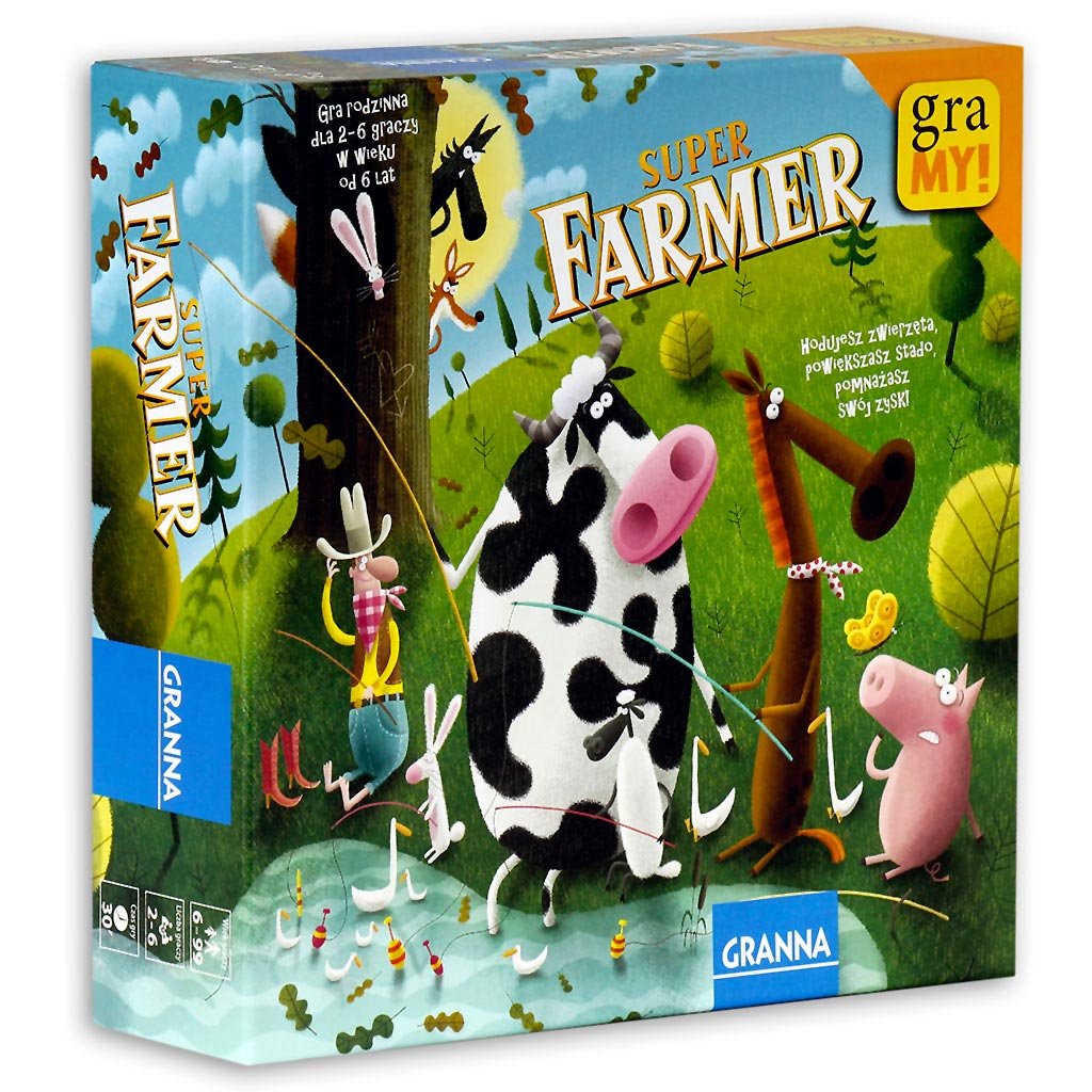 Super Farmer / Karol Borsuk ; projekt graf. i il. Piotr Socha. - Warszawa : Granna, 2014 - 1 gra (4 plansze, 2 dwunastościenne kostki, 120 kartoników z obrazkami zwierząt: 60 królików, 24 owce, 20 świń, 12 krów, 4 konie, 4 plastikowe małe psy, 2 plastikowe duże psy, 1 instrukcja) : karton, tektura, plastik, ilustracje, wielokolorowy ; w pudełku 26 x 26 x 8 cm + instrukcja (9, [3] strony : ilustracje ; 15 cm).